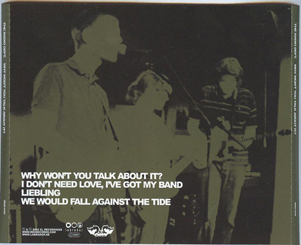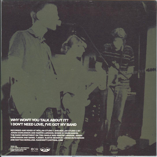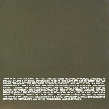 | Credits: | “Why Won’t You Talk About It?” and “Liebling” were recorded, produced and mixed at Mollan studio 1 by Johan Duncanson. “I Don’t Need Love, I’ve Got My Band” and “We Would Fall Against The Tide” were recorded, produced and mixed at Mollan studio 1 and Mollan studio 2 by Johan Duncanson and martin Larsson. Songs by Duncanson except “Liebling” by Duncanson/Rieloff and “We Would Fall Against The Tide” by Larsson/Duncanson. The Radio Department on this EP was: Martin Larsson – Guitars, backing vocals and keyboards Johan Duncanson – Vocals, Guitars and Keyboards Daniel Tjader – Keyboards on “I Don’t Need Love, I’ve Got My Band” Mattias Rieloff – Keyboards on “Liebling”. Sleeve design by Johan Duncanson and Mattias Berglund. All songs published by Labrador Music |